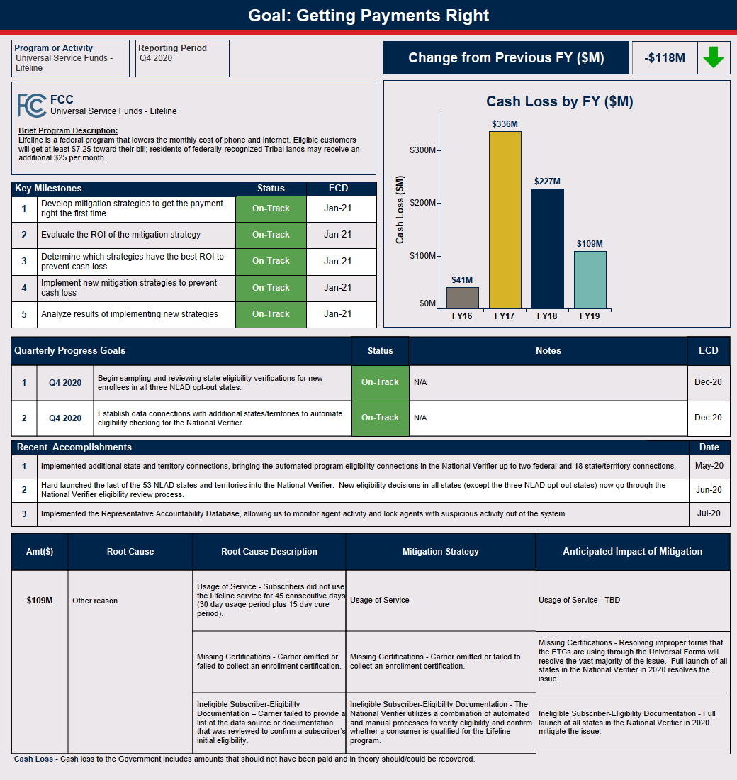 recapture audits known as Beneficiary and Contributor Audit Program (BCAP). BCAP audits are designed to identify overpayments that must be recaptured, assess compliance with FCC rules, and deter waste, fraud, and abuse. Further, the FCC works through USAC’s improper payment testing program known as Payment Quality Assurance (PQA). Through PQA, USAC utilizes a statistical sampling methodology to estimate the annual amount of improper payments in the USF-HC, USF-LL, USF-RHC, and USF-S&L programs. The goal of the PQA assessment plan is to estimate an improper payment error rate based on non-compliance with FCC rules. To recover improper payments, the FCC and USAC have implemented an enterprise recovery policy to standardize the reporting and recovery of improper payments. All improper payments are deemed collectible and funding is either recovered or is in the process of being recovered.