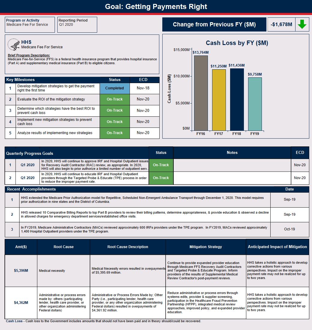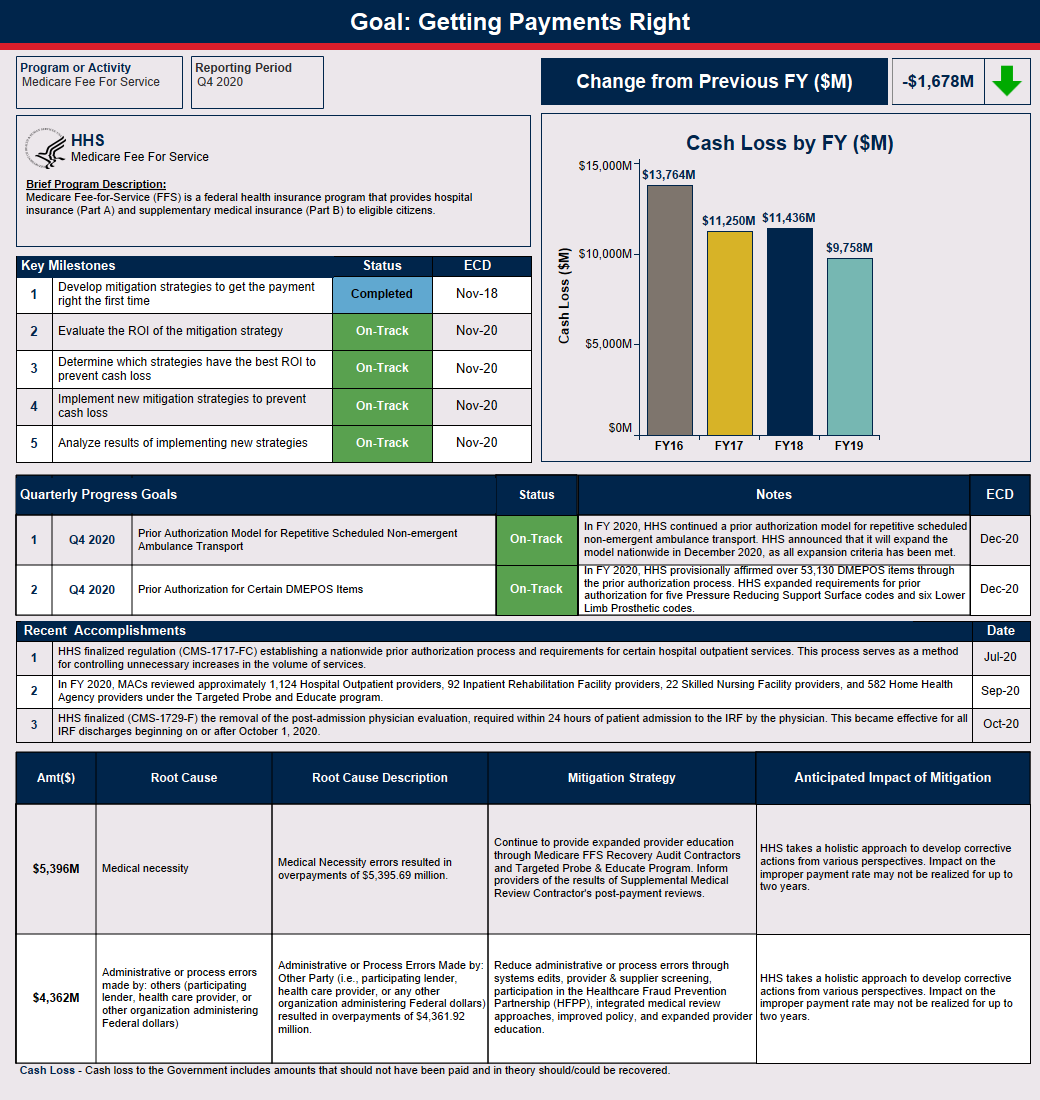 Medicare Fee-for-Service (FFS) is a federal health insurance program that provides hospital insurance (Part A) and supplementary medical insurance (Part B) to eligible citizens. The primary causes of overpayments continue to be insufficient documentation and medical necessity errors for skilled nursing facilities, hospital outpatient, hospice, and home health claims. A known barrier to preventing improper payments is that providers' and suppliers' compliance with requirements is outside of the agency's control.