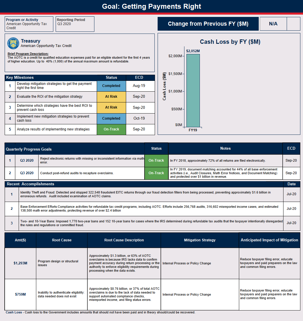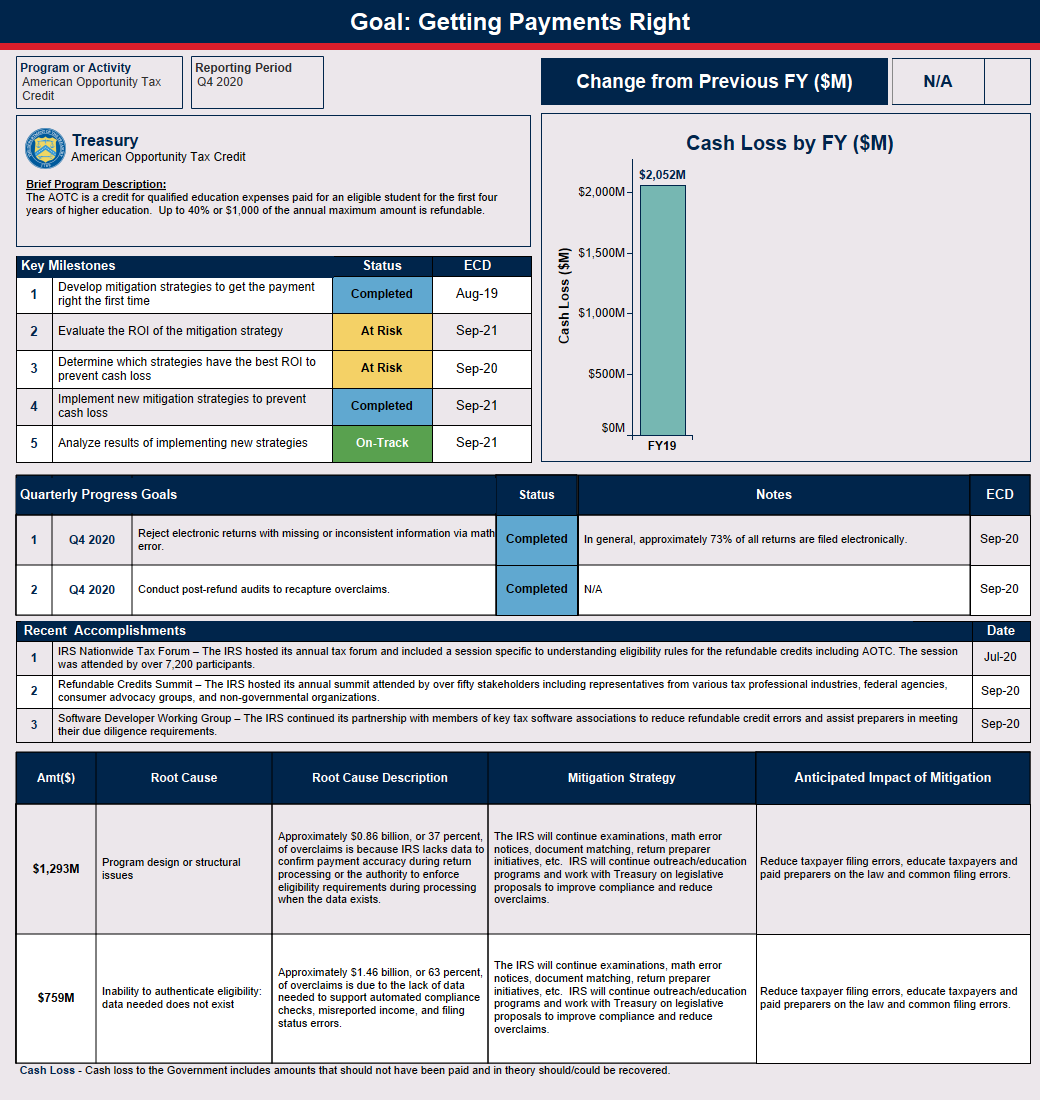 The American Opportunity Tax Credit (AOTC) is a credit for qualified education expenses paid for an eligible student for the first four years of higher education. $0.57B of AOTC overclaims are caused when information needed to authenticate eligibility does not exist at the time of filing. Automated compliance checks cannot provide validation without the necessary data causing IRS to verify eligibility via audit. $0.97B of AOTC overclaims are caused when validation data is not available to confirm payment accuracy at the time the tax return is processed.