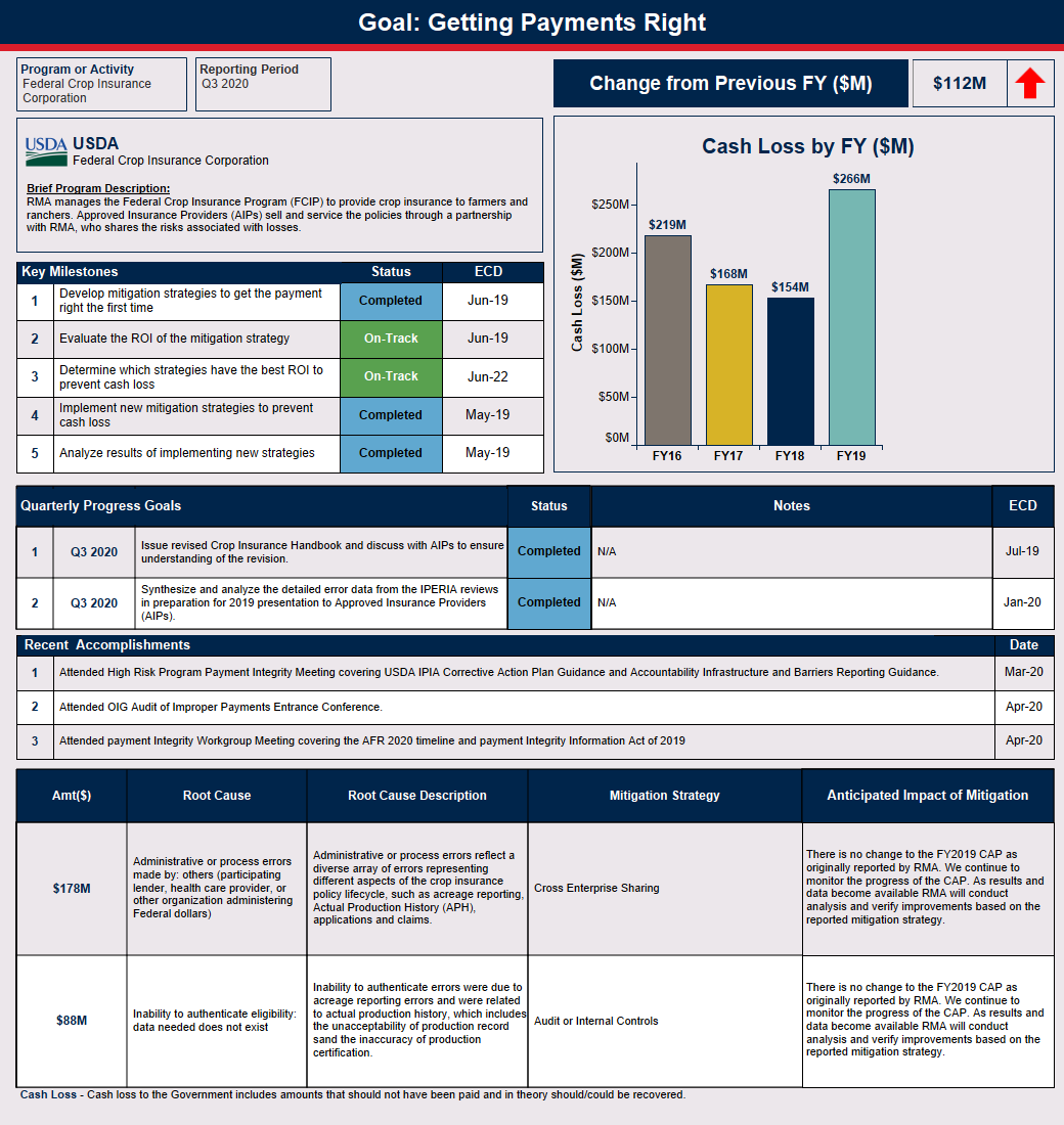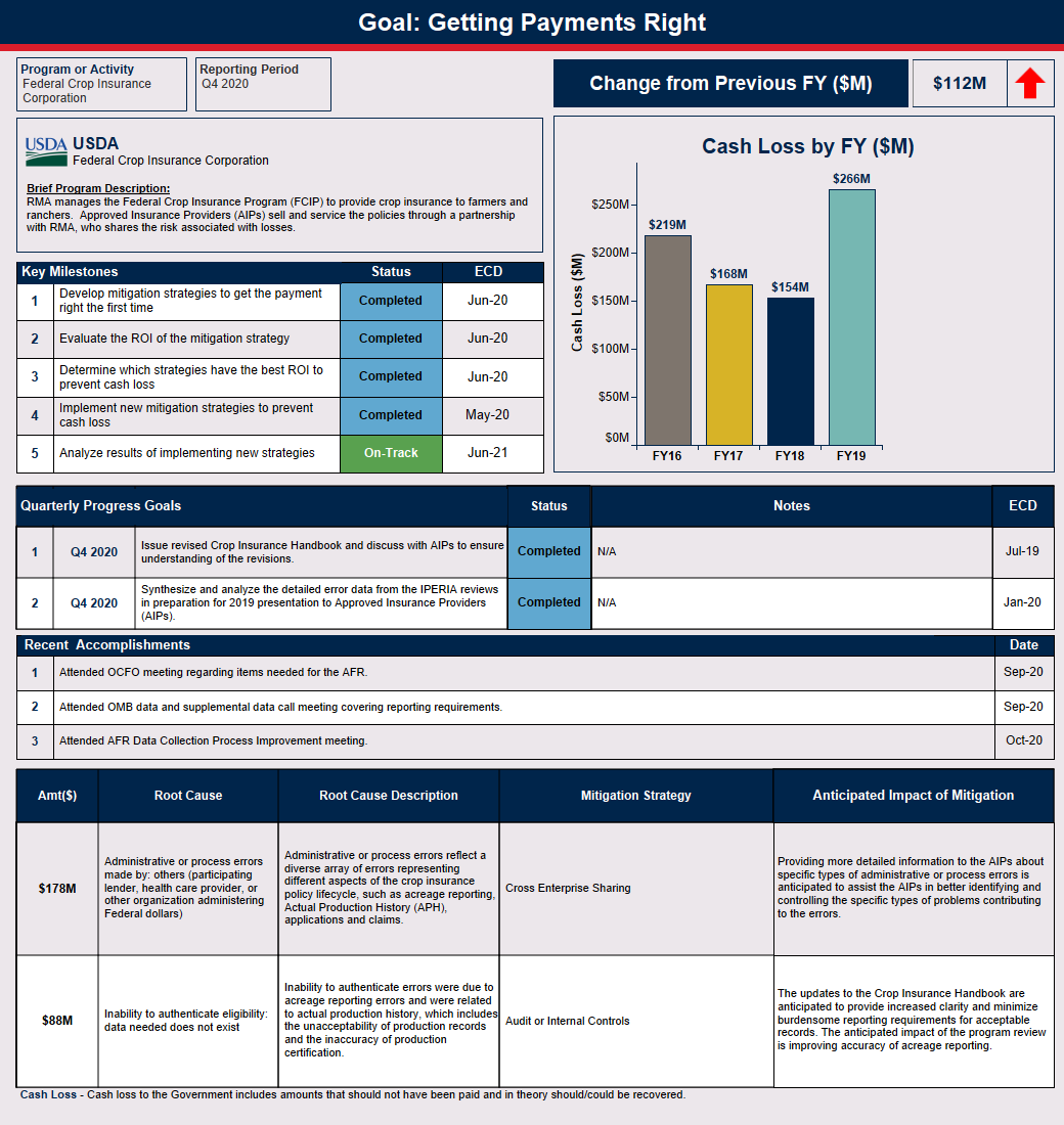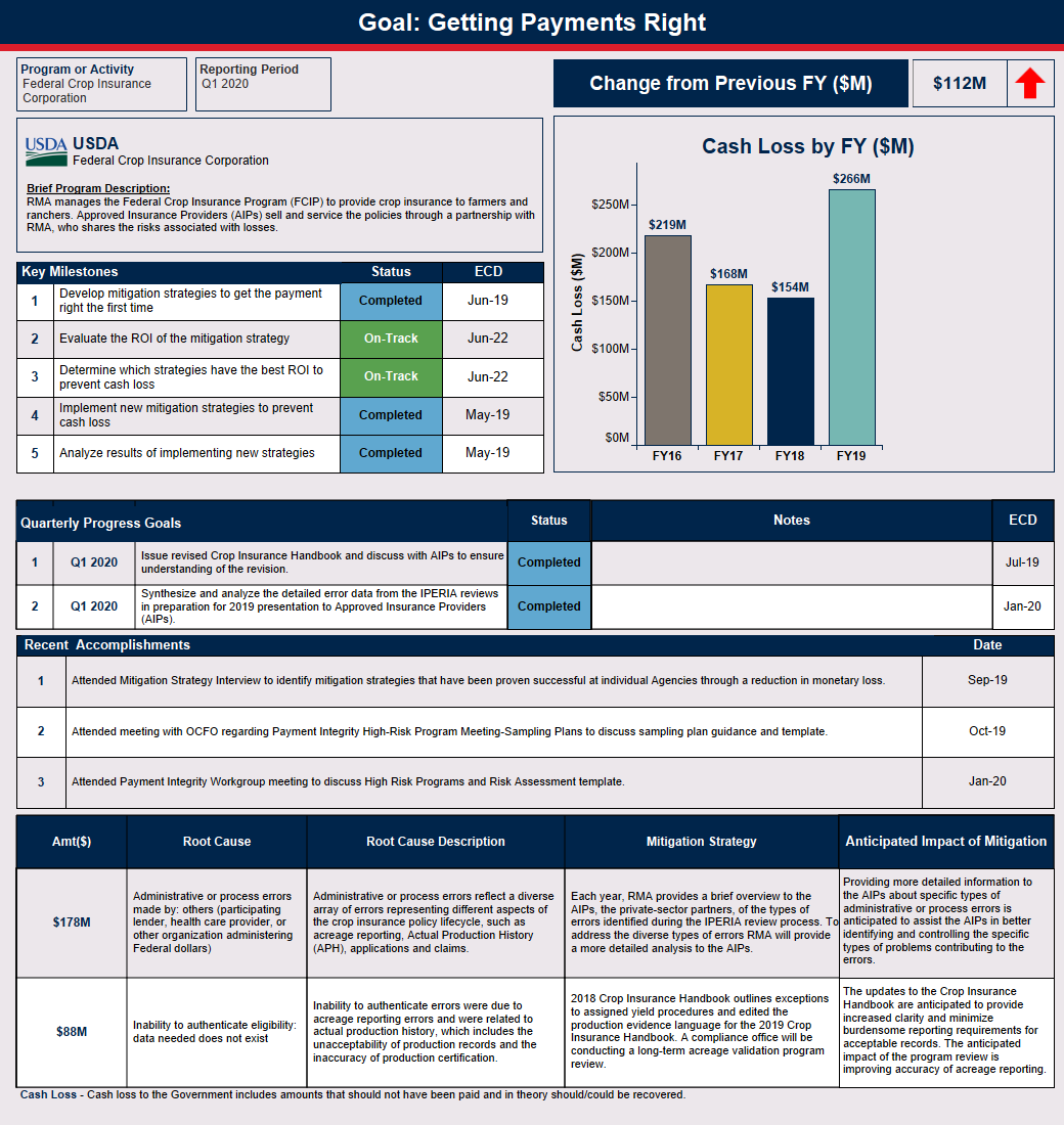 RMA’s comprehensive analysis of improper payment root cause data enables the development of targeted corrective action plans based on cause category, error types, crop insurance lifecycle stages, crop types, states, insurance plans, and other key variables. From there, corrective action plans are designed to influence or change behavior, update current procedures, disseminate informational memorandums, revise policy language, introduce new policy language or procedures, and leverage data analytics. They are also closely integrated with ongoing internal processes such as the AIP Performance Reviews. This approach, combined with continuous root cause analysis and aligned corrective action efforts from other RMA initiatives has proven to be effective as exhibited in RMA’s ability to consistently report one of the lowest improper payment rates across USDA, all while administering a multi-billion-dollar federal crop insurance program.