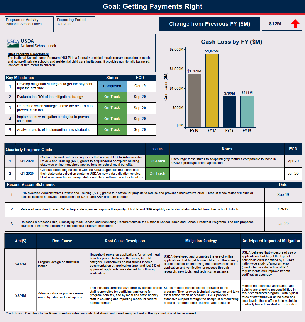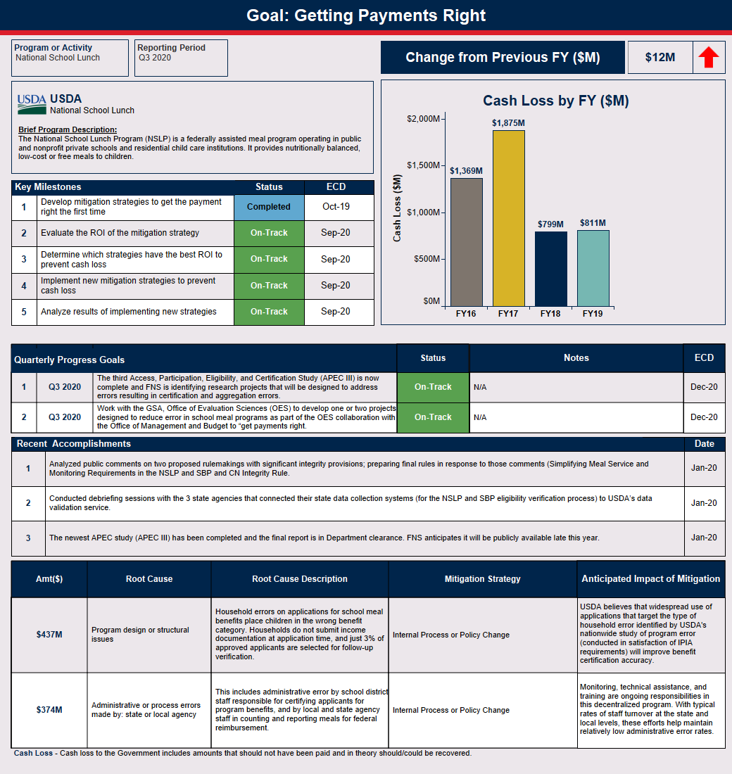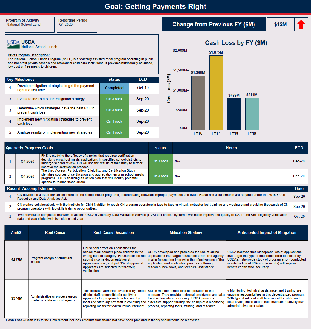 Program sponsors and operators have binding agreements with the administering State Agencies (SAs) to operate Food and Nutrition Service (FNS) the National School Lunch Program (NSLP) according to all program rules. SAs have binding agreements with FNS to administer the Federal programs in accordance with applicable regulations, guidance, and instructions. FNS has a robust review process that includes state-level review of local program operators and FNS-level reviews of SAs to ensure program integrity in the NSLP. Additionally, at the federal level, senior executives are held responsible for program oversight and integrity via the annual strategic planning process and performance system.
