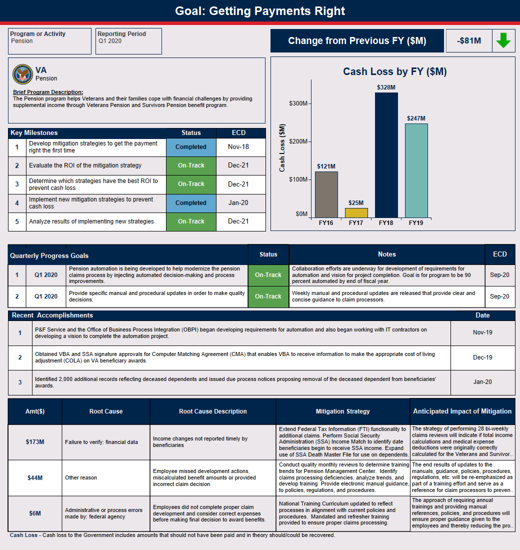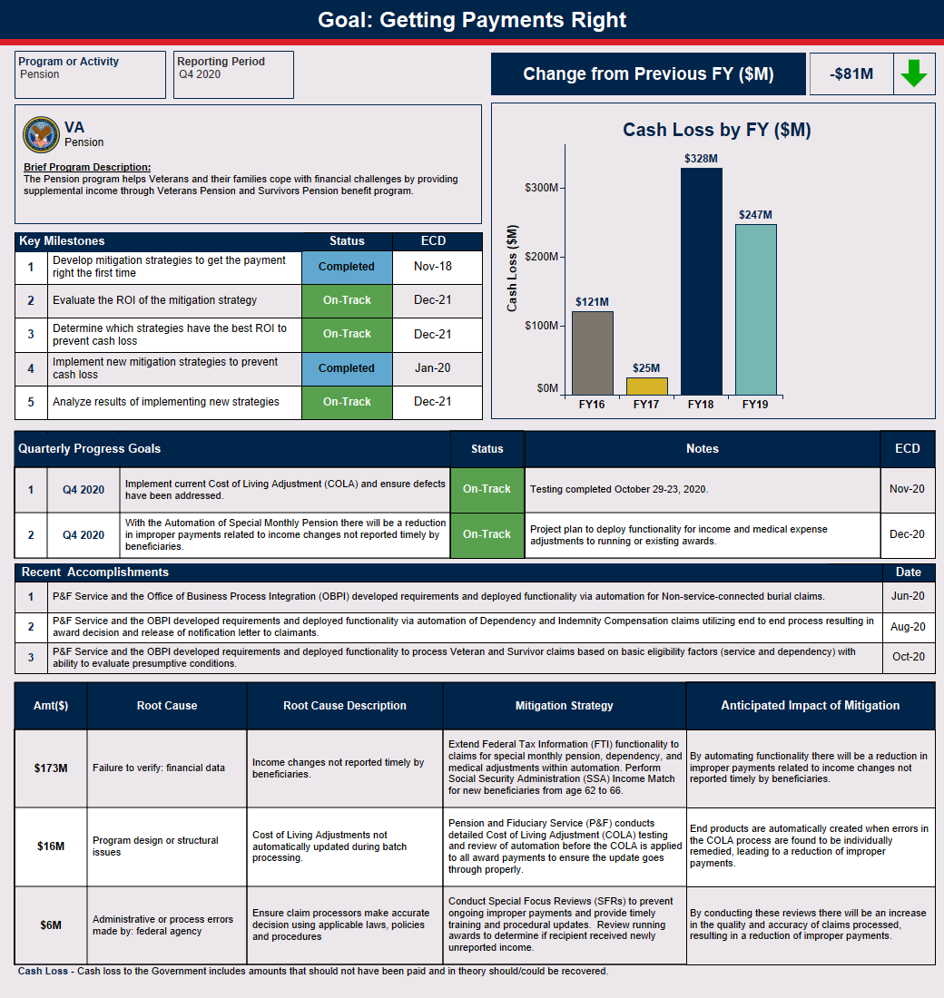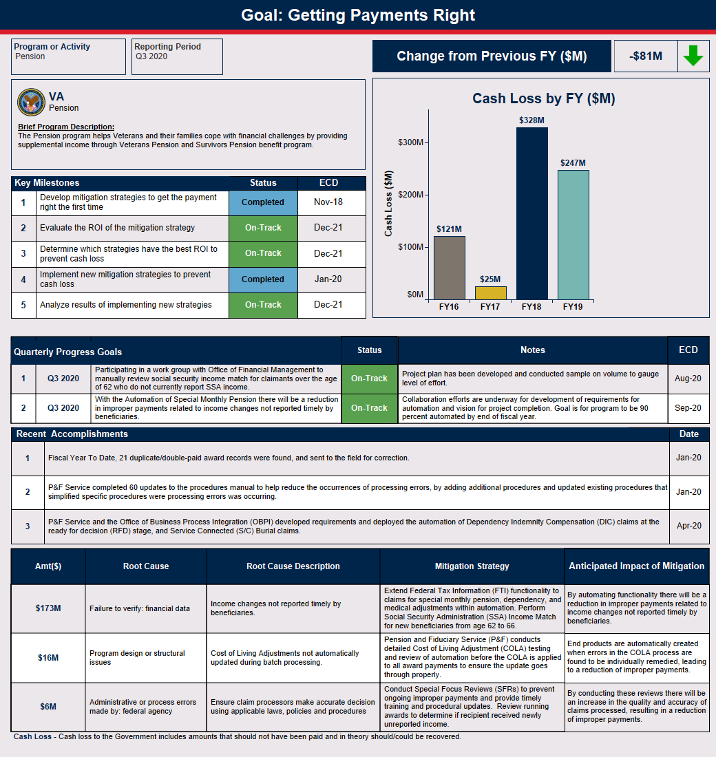 The Pension program helps eligible Veterans and their survivors cope with financial challenges by providing supplemental income through Veterans and Survivors Pension Benefits. A change in benefit payment occurs when a required adjustment is made due to a status change (e.g., change in income, net worth, medical expenses, dependency, etc.); which caused a projected $381.78 million in monetary loss in FY 2024. A known barrier is relying on beneficiaries to notify the VA when they experience life or financial changes since these factors may impact continued eligibility. When applicable, the VA pursues debt collection by offsetting benefit payments for the full amount of the debt or by approved repayment installments.