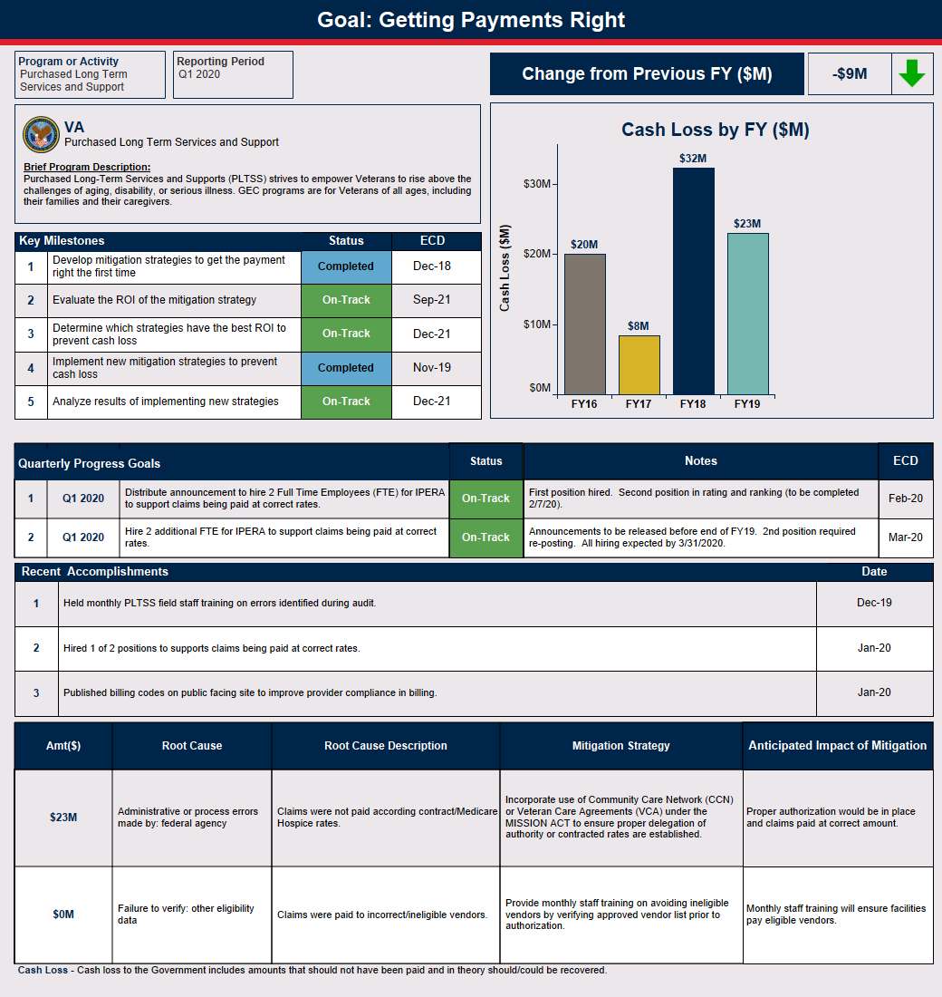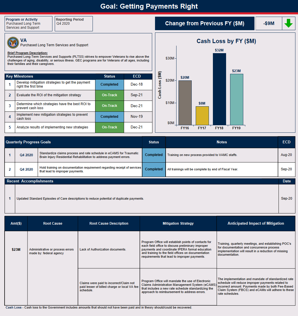 The Purchased Long Term Services and Supports (PLTSS) program is organizationally aligned under the VHA Geriatrics and Extended Care (GEC) Office that strives to advance quality care for aging and chronically ill Veterans by providing policy direction for the development, coordination, and integration of geriatrics and long-term care clinical programs. The program reported $218.30 million in projected monetary loss for FY 2024, which resulted from paying for claim amounts that exceeded the contract rate, claims not received within the required timeframe, or billed services that exceeded the authorized care. There are no known financial, contractor or provider status related barriers prohibiting improving prevention of improper payments.